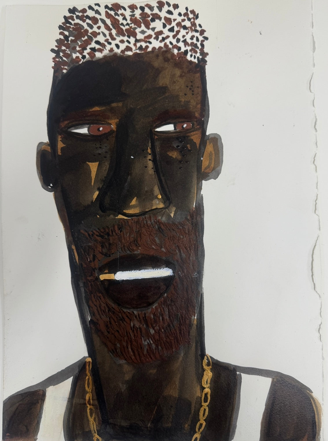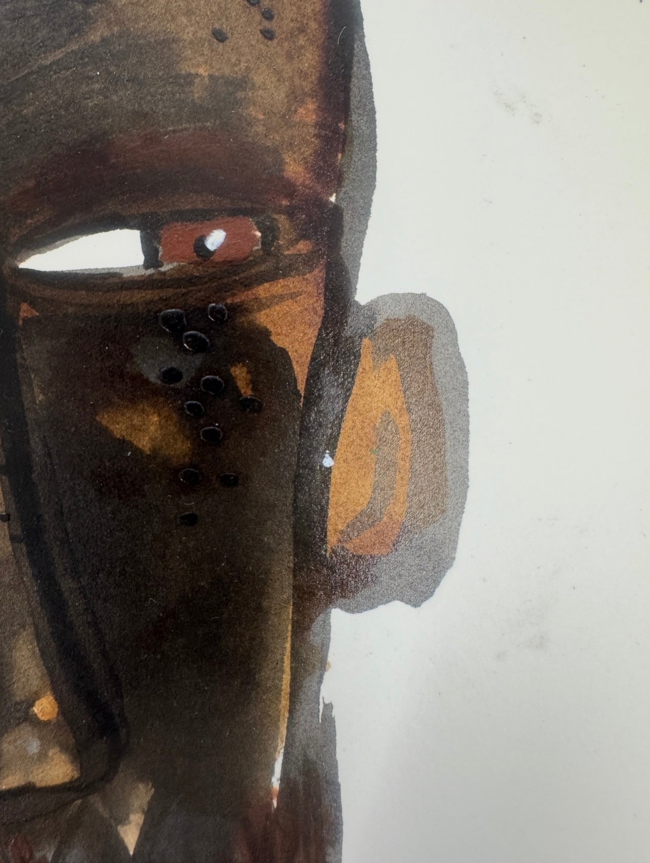 This expressive figurative portrait presents a solitary Black male figure rendered in ink and paint on paper, marked by an intense, watchful gaze and a quiet psychological charge. The elongated face, angular structure, and side-glancing eyes create a sense of tension and self-awareness, while the restrained palette of deep browns, blacks, ochres, and muted whites gives the work both gravity and warmth.